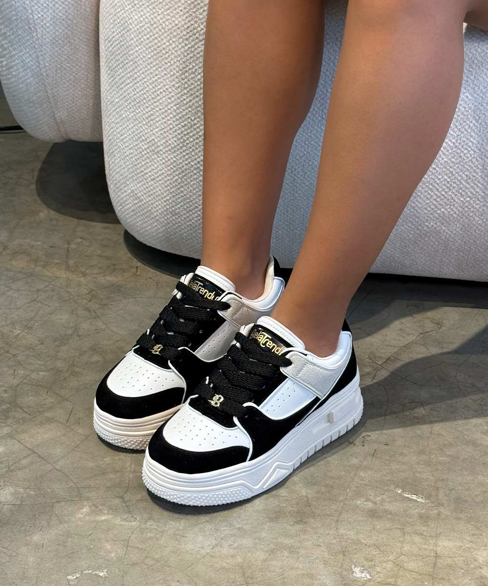 Tenis chunky blanco y negro para mujer con diseño moderno y suela alta. Comodidad, estilo...