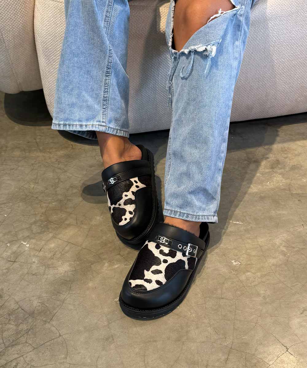 Zuecos negros para mujer con estampado cow print y diseño moderno. Un mix de actitud,...