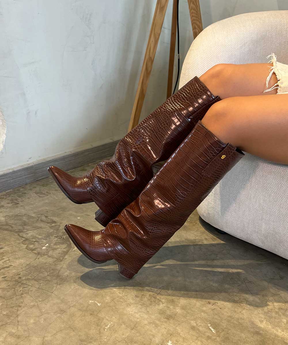 Botas caña alta color mocca para mujer con textura tipo croco, efecto arrugado y punta...