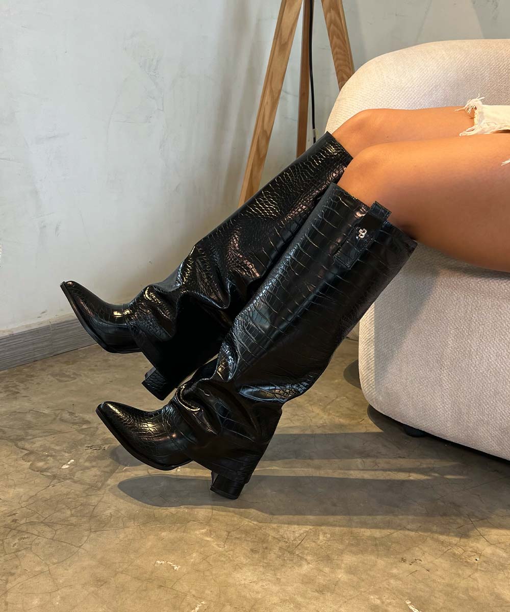 Botas caña alta negras para mujer con textura tipo croco, efecto arrugado y punta fina....