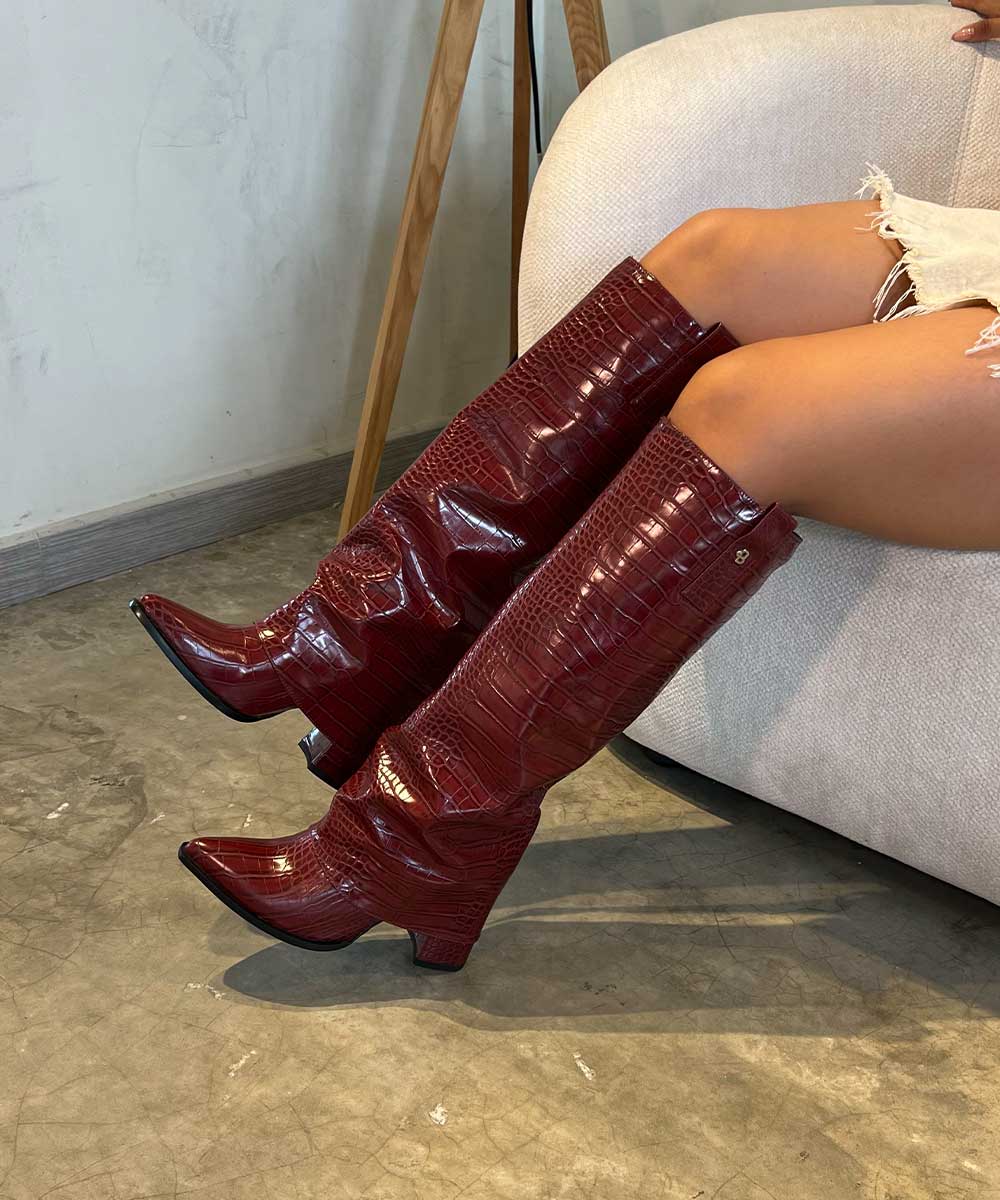 Botas caña alta vinotinto para mujer con textura tipo croco, efecto arrugado y punta fina....